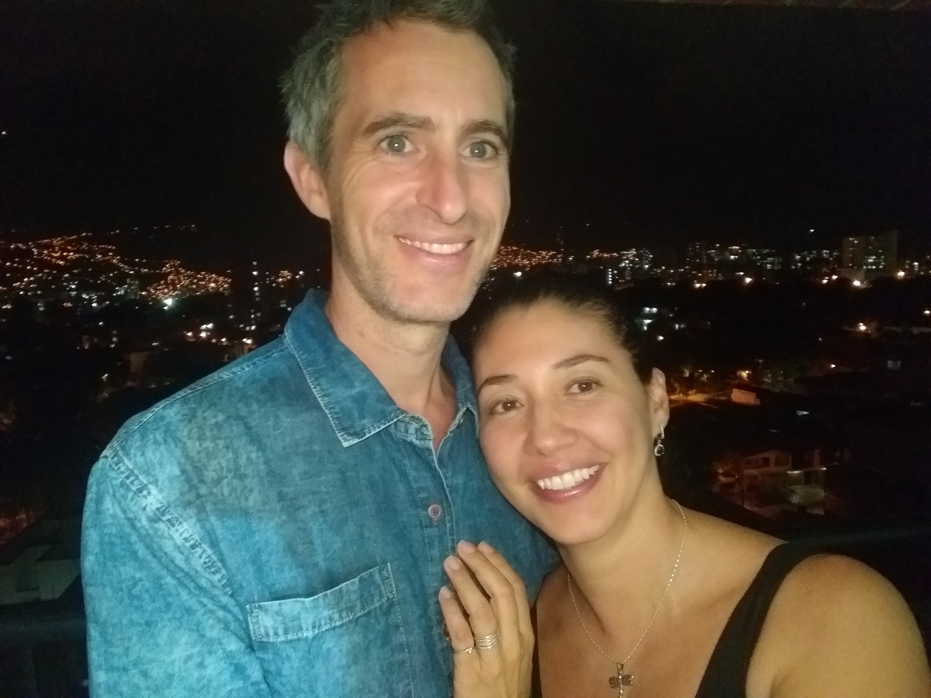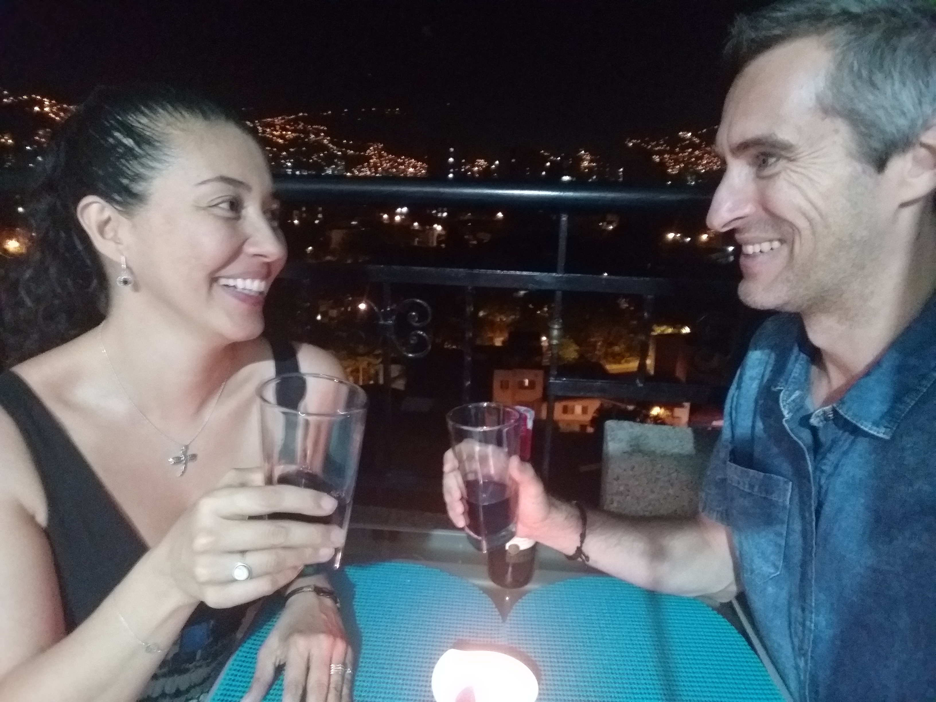 I chose my regular hot mexican crepe and Sandra chose prawns. We got dressed up and moved the table and chairs out to the balcony to enjoy the balmy evening air and the view of lights of Communa 13 spilling down the mountainside.