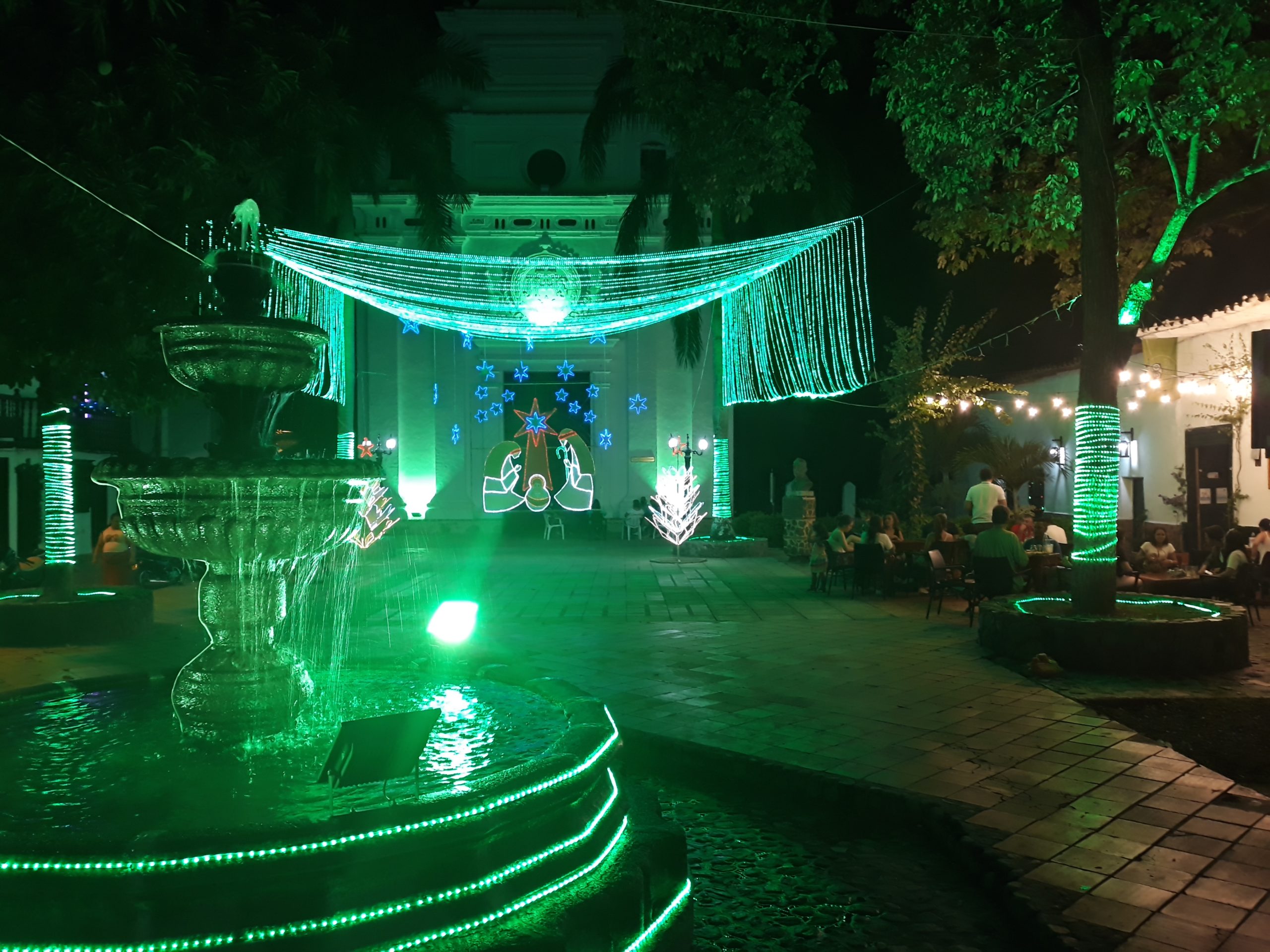 Aside from our respective forms of relaxation, we ventured out into the heat a couple of times each day to eat and explore. Night time was best with cooler air and Christmas lights decorating the various squares around the town, and we had dinner one night beneath the unrestored wall of the cathedral.